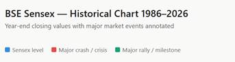 The pandemic triggered the fastest-ever bear market. Sensex fell from ~42,000 to below 26,000 in March 2020 — a 38% crash in weeks — before a dramatic recovery. - 2021 — Post-COVID boom