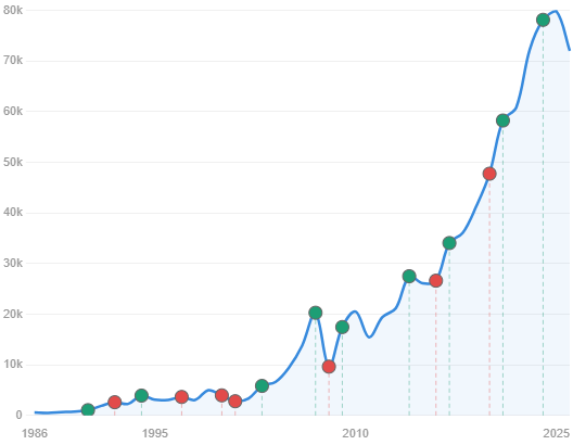 Here’s the BSE Sensex chart from 1986 to today, with all the major events marked. A few highlights from the journey: